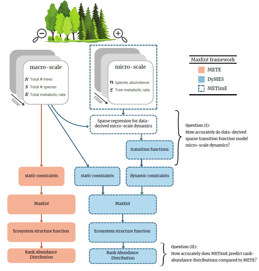 The Maximum Entropy Theory of Ecology (METE) derives probability distributions for micro-scale variables, such as species abundances and metabolic rates, solely from macro-scale observables, such as total abundance and species richness. While METE performs well in systems with relatively constant macro-scale observables, its predictive accuracy declines in disturbed or rapidly changing systems. To address evolving macro-scale observables, the theory of Dynamic Maximum Entropy across Entwined Scales (DyMES) was recently introduced. DyMES imposes additional constraints on the micro-scale probability distribution that link macro- and micro-scale dynamics. Macro-scale dynamics are expressed through time derivatives of METE's observables, while micro-scale dynamics are modeled using prescribed mechanistic transition functions. However, these transition functions rely on prior system-specific knowledge, introducing assumptions into the otherwise assumption-free MaxEnt framework. We introduce METimE, a dynamic MaxEnt framework that derives transition functions directly from data via sparse regression on observed micro- and macro-variables. This general approach enables application across diverse systems without reliance on specific mechanistic assumptions. Using time-series data, both simulated and empirical, we derive METimE's transition functions and evaluate their accuracy in predicting changes in species abundances. We then apply these transition functions to MaxEnt inference of species abundance distributions. Our findings show that data-derived transition functions can reliably model micro-scale dynamics when there is enough variance and species behave similarly. However, differences in species behaviors and stochasticity create challenges that require further investigation. Incorporating data-derived transition functions into the METE framework has improved MaxEnt inference of micro-scale probability distributions, with greatest improvements in disturbed systems, indicating that METimE offers a data-derived alternative to METE and DyMES in such systems.