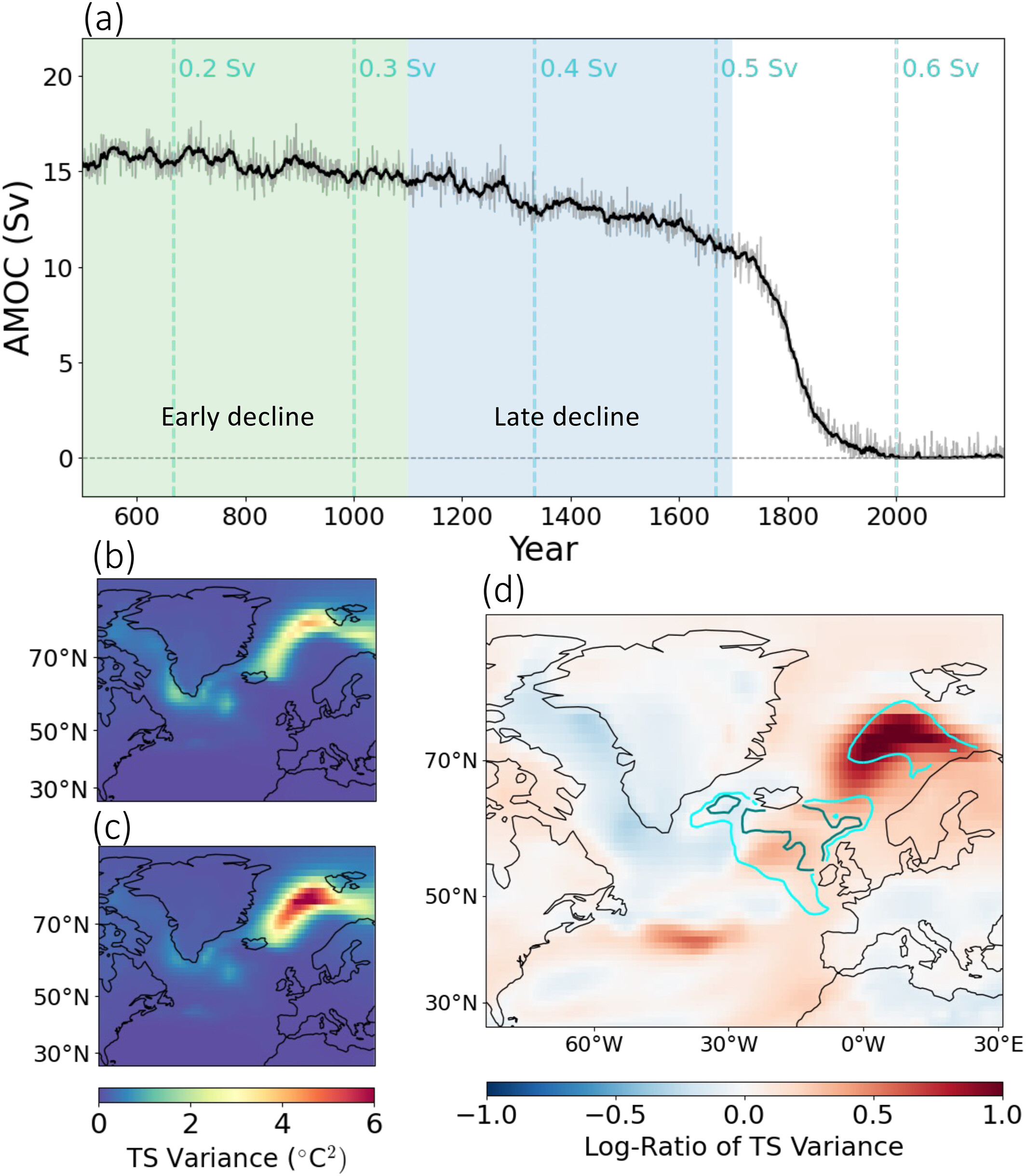 The subpolar North Atlantic (SPNA) exhibits rapid, decadal-scale cooling events in several climate model projections, but the mechanisms behind this variability, particularly the role of a weakening Atlantic Meridional Overturning Circulation (AMOC), remain uncertain. Here we analyze model output from a quasi-equilibrium hosing experiment using the Community Earth System Model version 1 (CESM1) to assess SPNA variability under a gradually declining AMOC. During a 600-year period preceding an AMOC collapse, the overturning strength weakens by ∼15% and decadal surface temperature variance in the Nordic Seas increases eightfold. Statistical analysis links this enhanced variability to feedbacks between ocean convection, salinity, and sea-ice, which strengthen under cooler background conditions associated with reduced AMOC strength. Our results suggest that even modest AMOC weakening is associated with substantially enhanced SPNA variability, pointing to increased regional climate variability under AMOC decline and to potential early warning indicators of AMOC collapse.